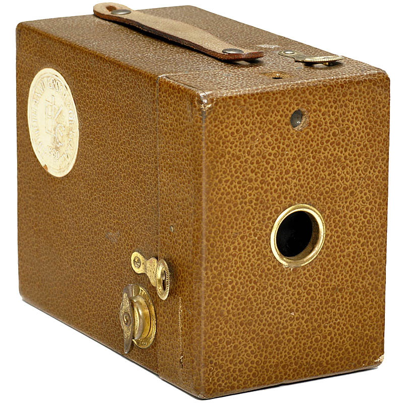 Eastman Kodak, Rochester. A special edition of the No. 2 Hawk-Eye Camera Model C, issued to commemorate the 50th anniversary of Eastman Kodak Co. Tan-colored reptile-grained covering, brass fittings, decorative! With a large gold-colored foil seal "… EKC 1880–1930".